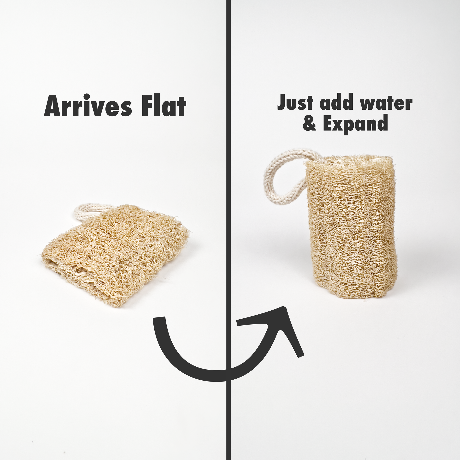 Arrives Flat, Blooms in Water To reduce packaging and shipping waste, your loofahs arrive conveniently flat and compressed. Just soak them in warm water for a few minutes and watch as they expand to their full, generous size.